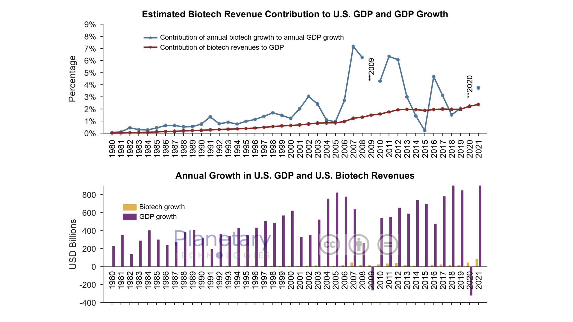 Figure 5. The estimated contribution of biotechnology revenues to U.S. GDP and GDP growth from 1980 to 2021, based on data and a numerical model (Sources: U.S. Department of Commerce, Planetary Technologies). Top: Absolute percentage of total GDP contributed by biotechnology and percentage of total GDP growth contributed by growth in biotechnology. Note that the biotechnology industry appears to be more stable than the economy as a whole, and during the recession beginning in 2007 the industry contributed 4%-8% of total economic growth. The 2009 and 2020 contribution to growth data are omitted because the U.S. economy contracted in those years.