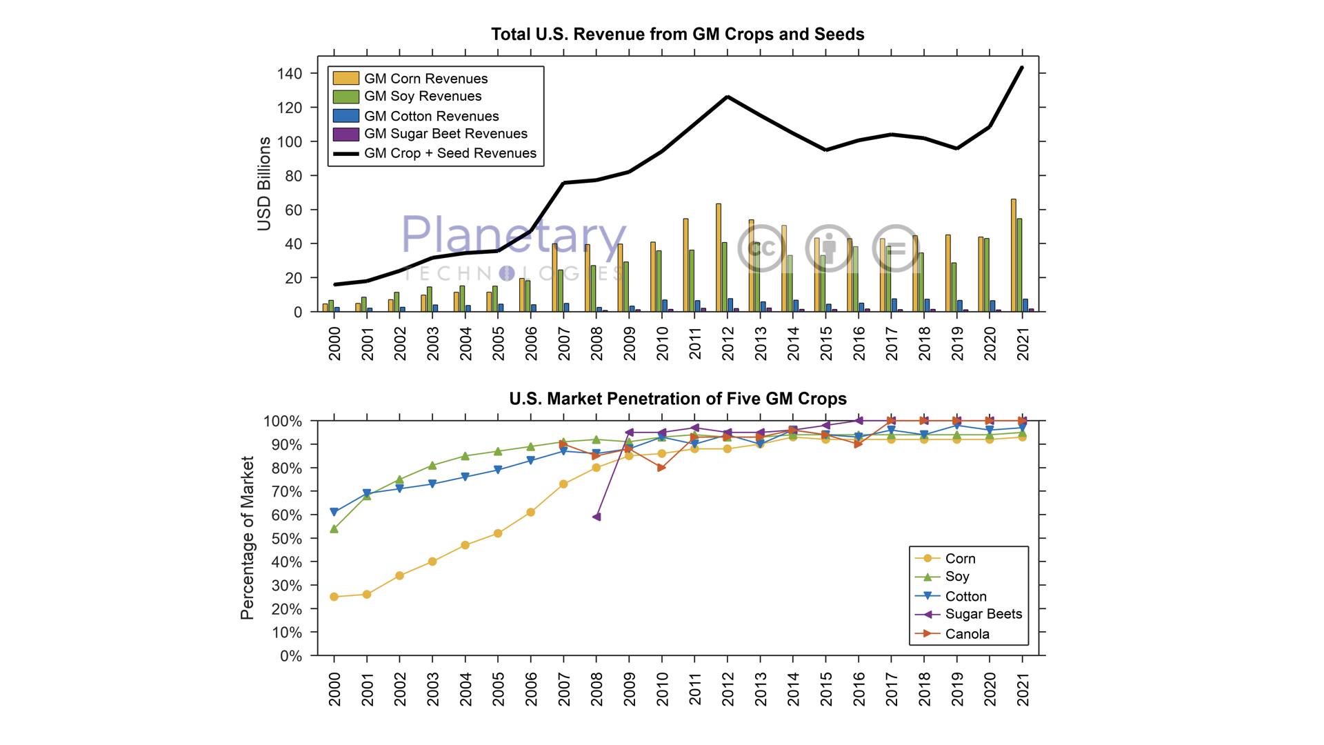 Figure 4. Total U.S. revenues from GM crops, 2000-2021. Top: Farm-scale revenues from seeds and four crops (includes multiple traits). The fall off in revenues between 2012 and 2015 was due to normal commodity price fluctuations rather than any decrease in adoption. Small contributions from GM papaya, alfalfa, canola are ignored here. (Source: USDA)
